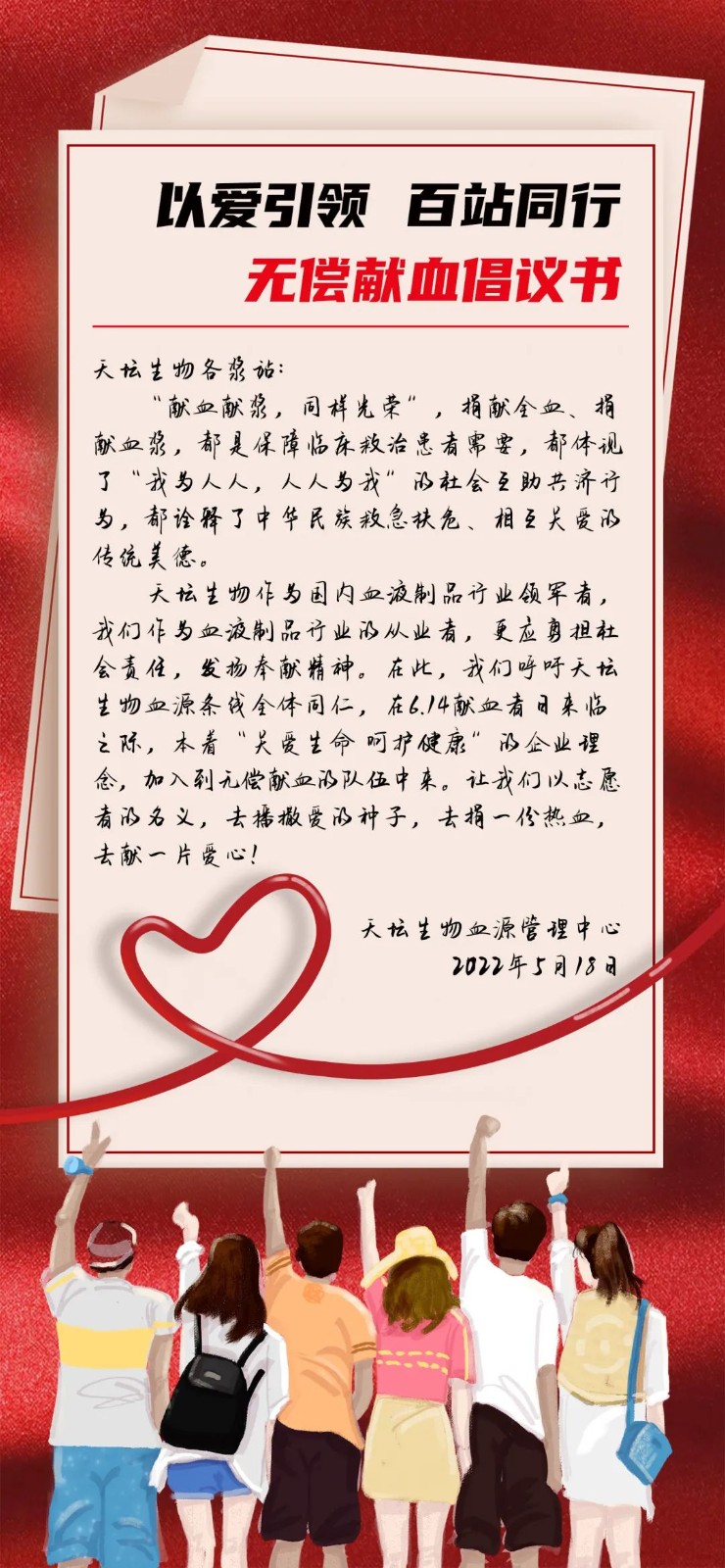 2022年6月14日,是第19個(gè)"世界獻(xiàn)血者日",天壇生物在全國(guó)各漿站組織了一場(chǎng)"以愛(ài)引領(lǐng) 百站同行"公益獻(xiàn)血活動(dòng)。